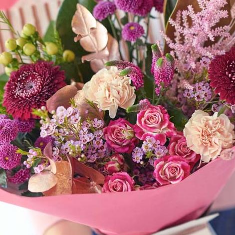A beautiful bouquet handcrafted by their local florist featuring blooms in cerise and purple tones, with soft pink, peach or lilac shades. It might also feature dried flowers or foliage painted in copper or rose gold.